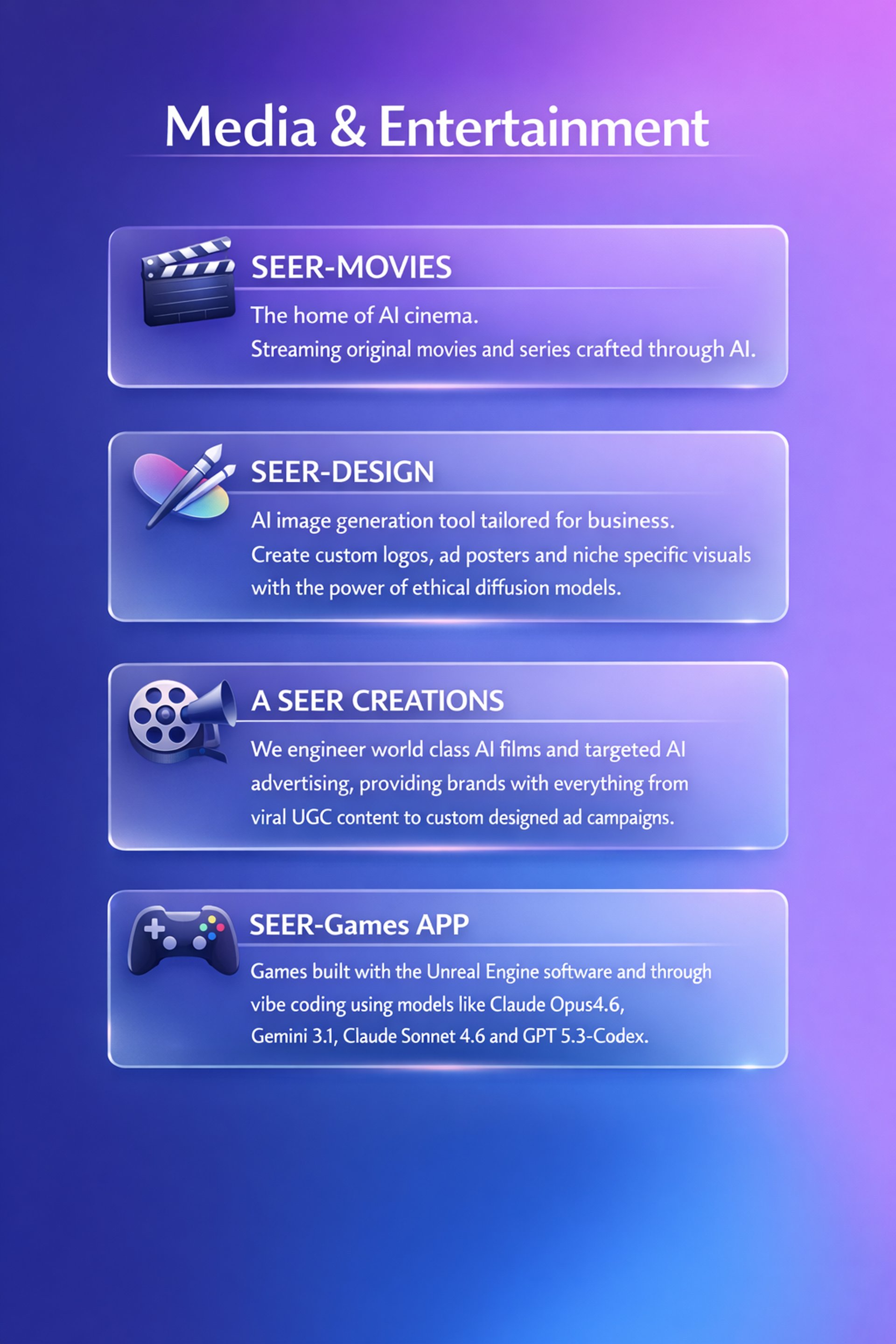 We engineer world class AI films and targeted AI advertising, providing brands with everything from viral UGC content to custom designed ad campaigns.